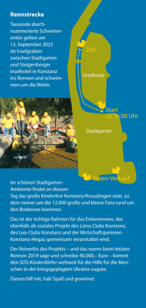 Tausende durchnummerierte Schwimmenten gehen am 13. September 2025 gegen 15.00 Uhr im Stadtgarten auf dem Inselgraben in Konstanz ins Rennen und schwimmen um die Wette. Die Nummern der Enten, die als erstes durchs Ziel kommen, gewinnen die tollen Preise.